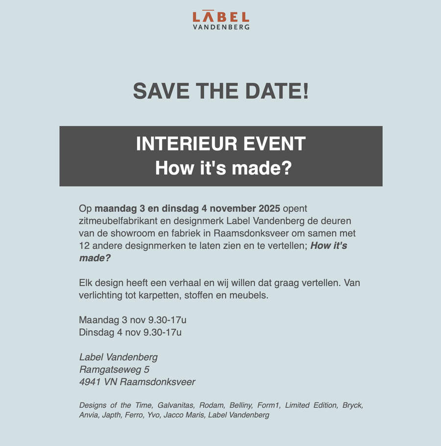 Op maandag 3 en dinsdag 4 november geven we, samen met nog 12 designmerken een vervolg aan het geslaagde voorjaarsevent bij Van Mokum. De dagen zijn vooral interessant voor architecten, stylisten en retailers, maar natuurlijk is iedereen welkom. Ik heb er veel zin in! Zie ik jullie daar?