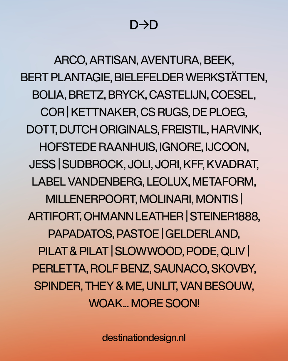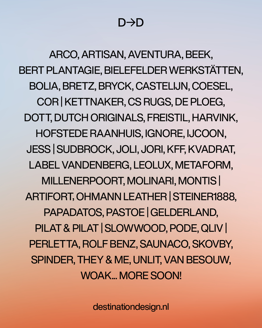 Dit jaar staat het meer dan ooit in het teken van ‘de kracht van ontmoeting’. Ik vind het geweldig om deel uit te maken van een groep ontwerpers die elkaar inspireren met hun producten, frisse ideeën en creatieve energie, waarbij innovatie en duurzaamheid centraal staan. Destination Design wordt gehouden in het Klokgebouw in Eindhoven en is bedoeld voor architecten, stylisten en designers. Voor ons een mooi moment om ons te presenteren tussen gevestigde merken zoals LABEL Vandenberg, Pilat&Pilat, Leolux en Gelderland.